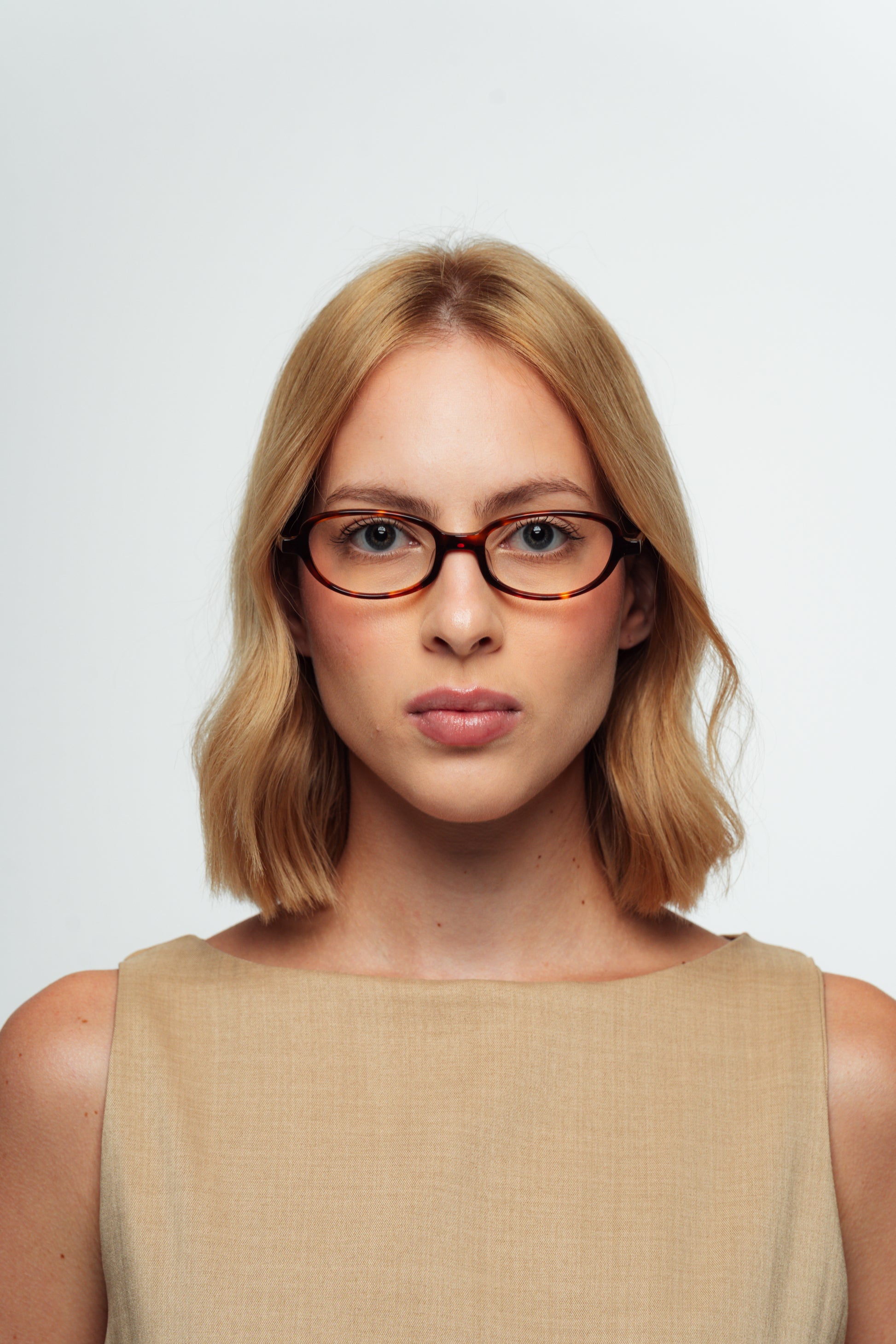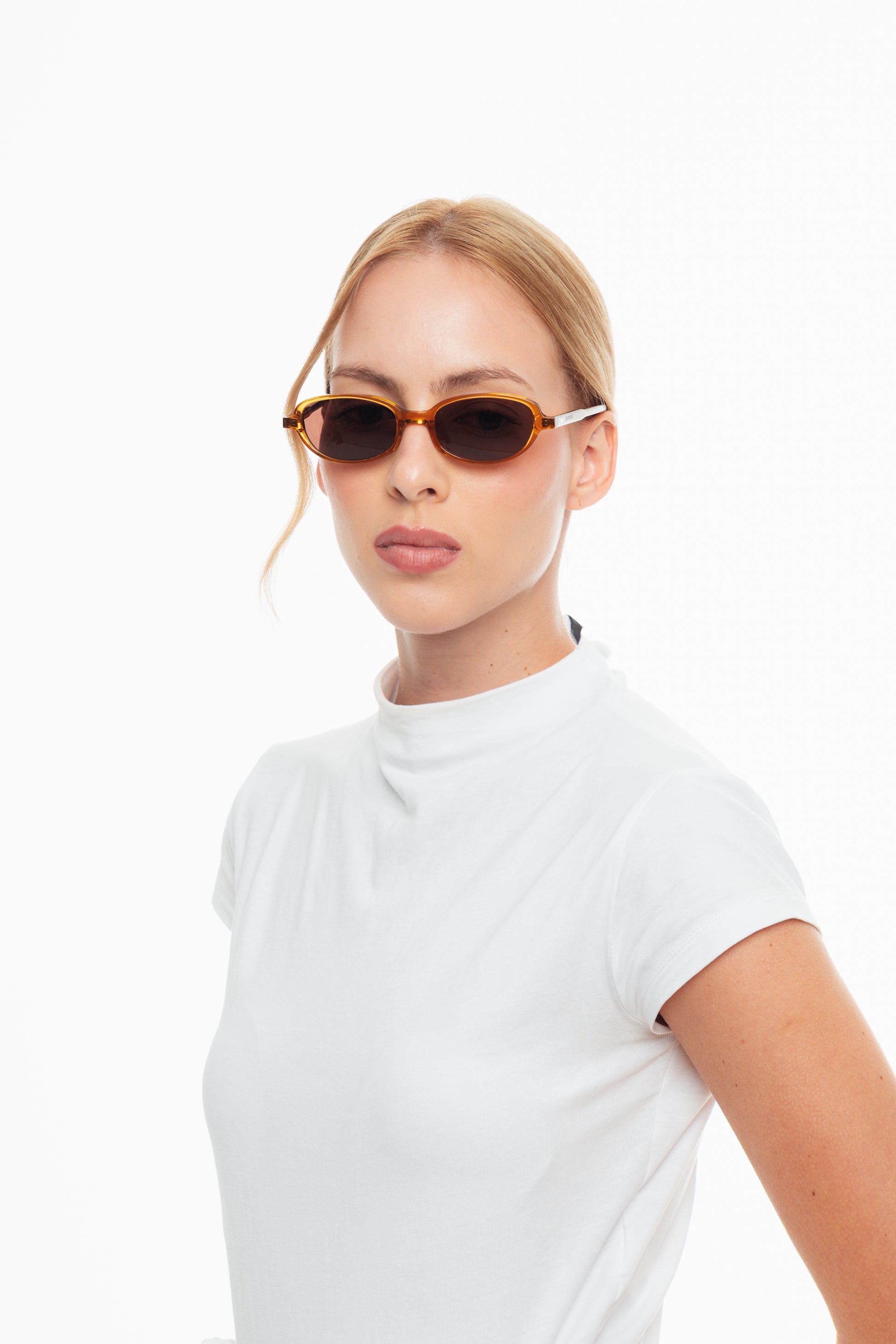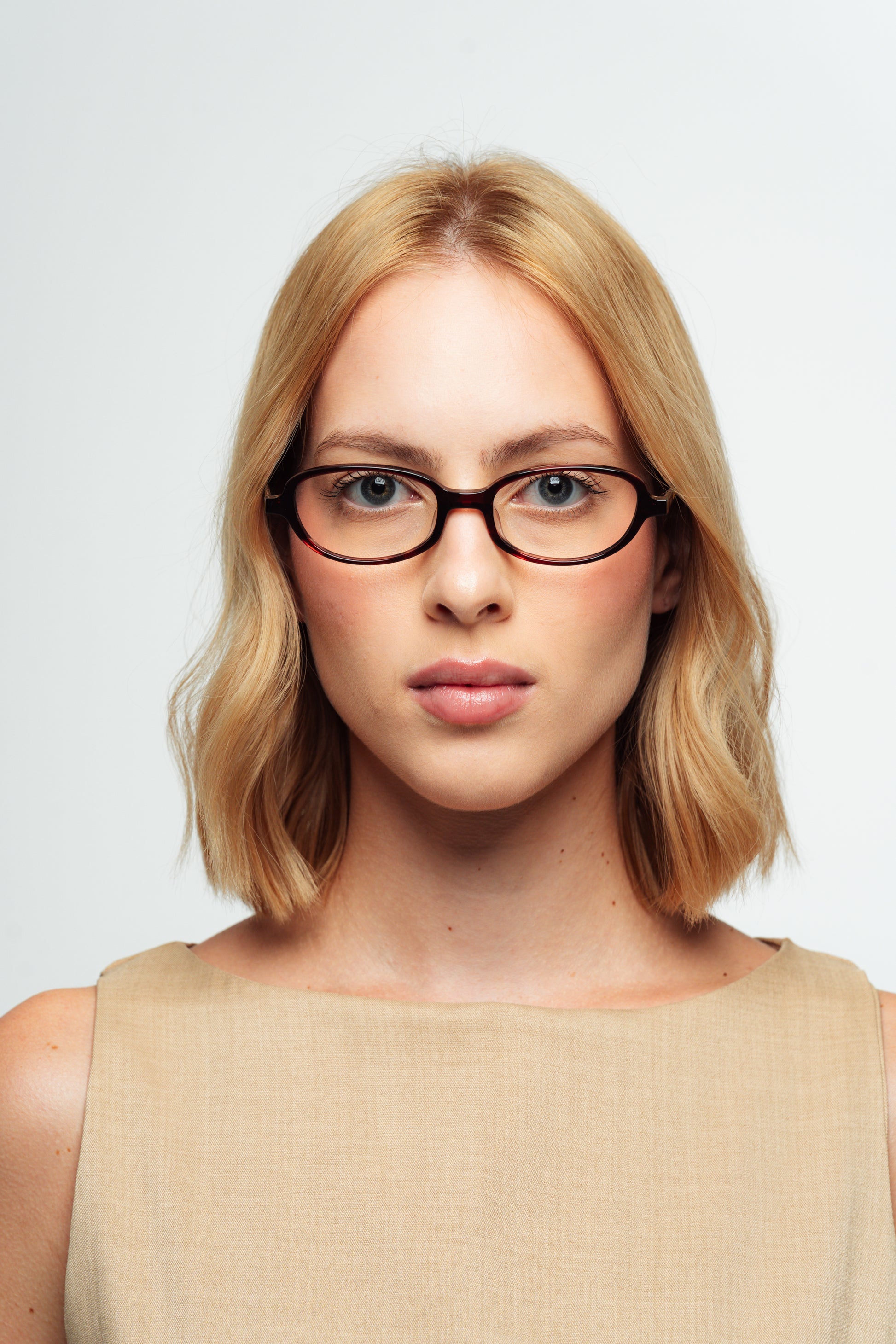 Armação com inspiração retrô e um toque contemporâneo; possui formato ovalado e altura pequena. Veste bem rostos pequenos e até médios.