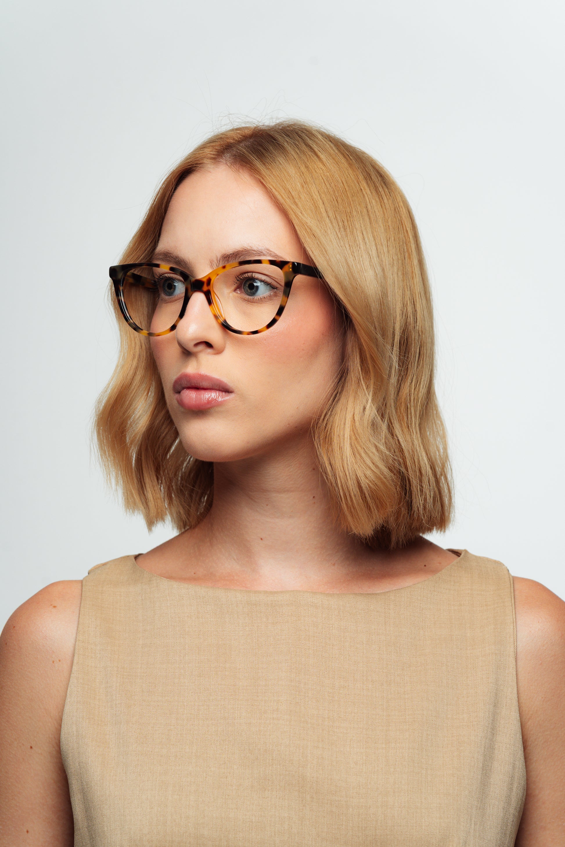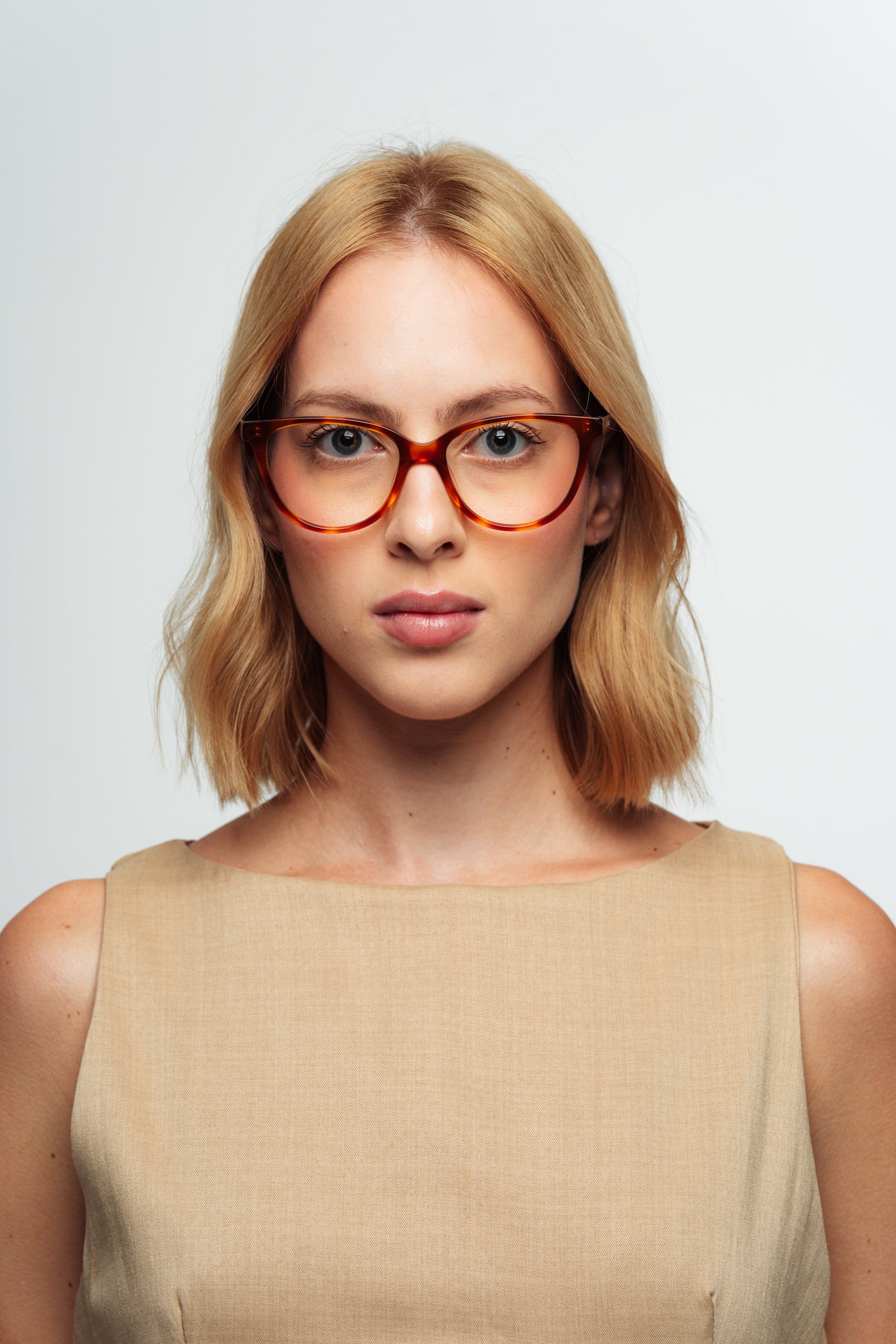 Armação gatinho com base arredondada. Veste bem rostos médios e largos.